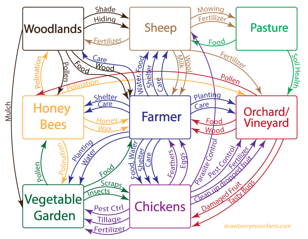Dans cette perspective, le potager n’est qu’un élément parmi d’autres. Il peut être important, central parfois, mais il n’est jamais isolé. Il dialogue avec les arbres, avec l’eau, avec les animaux, avec l’habitat, avec les chemins, avec les humains qui y travaillent et y vivent. En permaculture, chaque élément est pensé pour remplir plusieurs fonctions, et chaque fonction est soutenue par plusieurs éléments. Le jardinage agit sur une parcelle ; la permaculture relie l’ensemble.